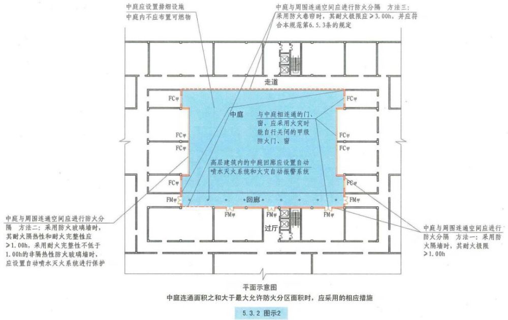 (1)中庭應與周圍相連通的空間進行防火分隔。采用防火墻時,其耐火極限不應低于1.00h;采用防火玻璃墻時,其耐火隔熱性和耐火完整性不應低于1.00h,,采用耐火完整性不應低于1.00h,采用耐火完整性不低于1.00h的非隔熱性防火玻璃墻時,應設置自動噴水滅火系統(tǒng)保護;采用防火卷簾時,其耐火極限不應低于3.00h,并應符合相關規(guī)定;與中庭相連通的門、窗,應采用火災時能自行關閉的甲級防火門、窗。