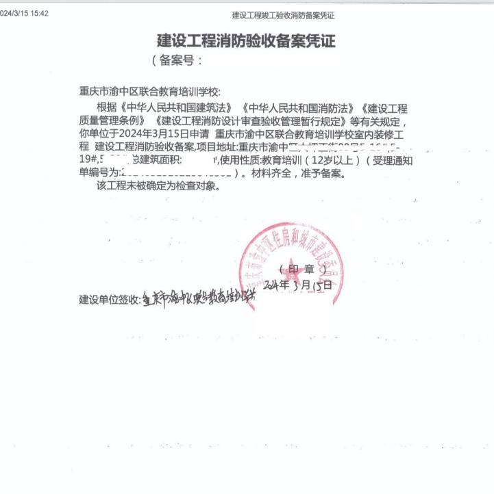 重慶市渝中區(qū)聯(lián)合教育培訓(xùn)學(xué)校消防備案案例-鼎堂消防